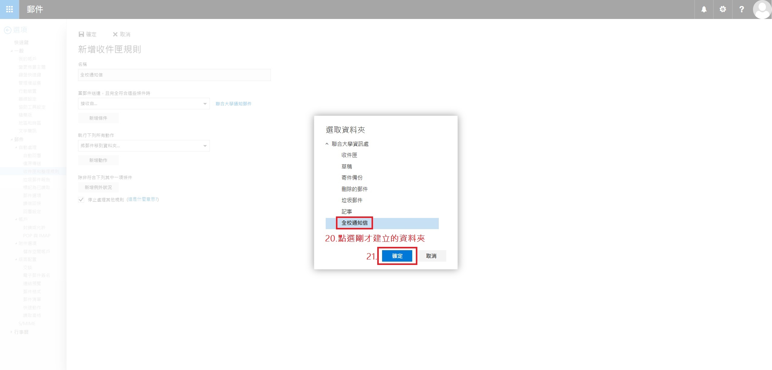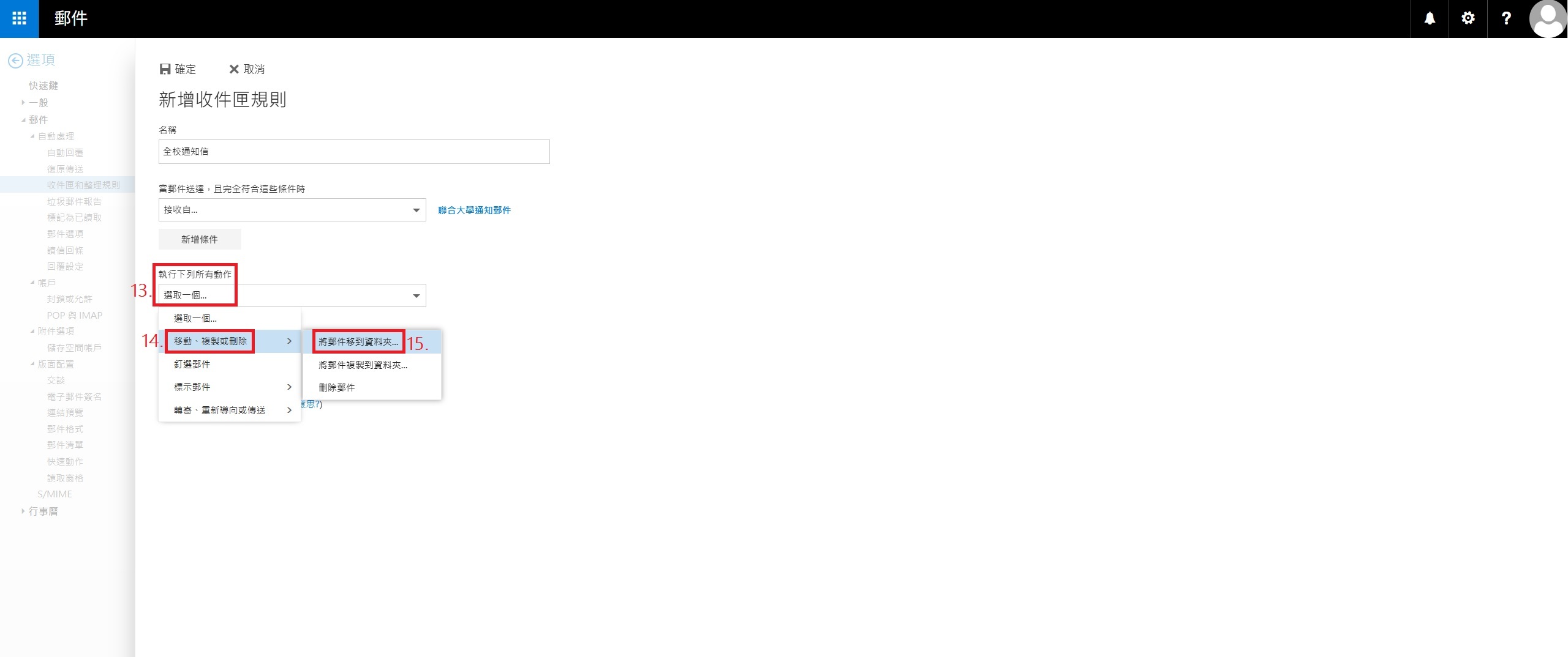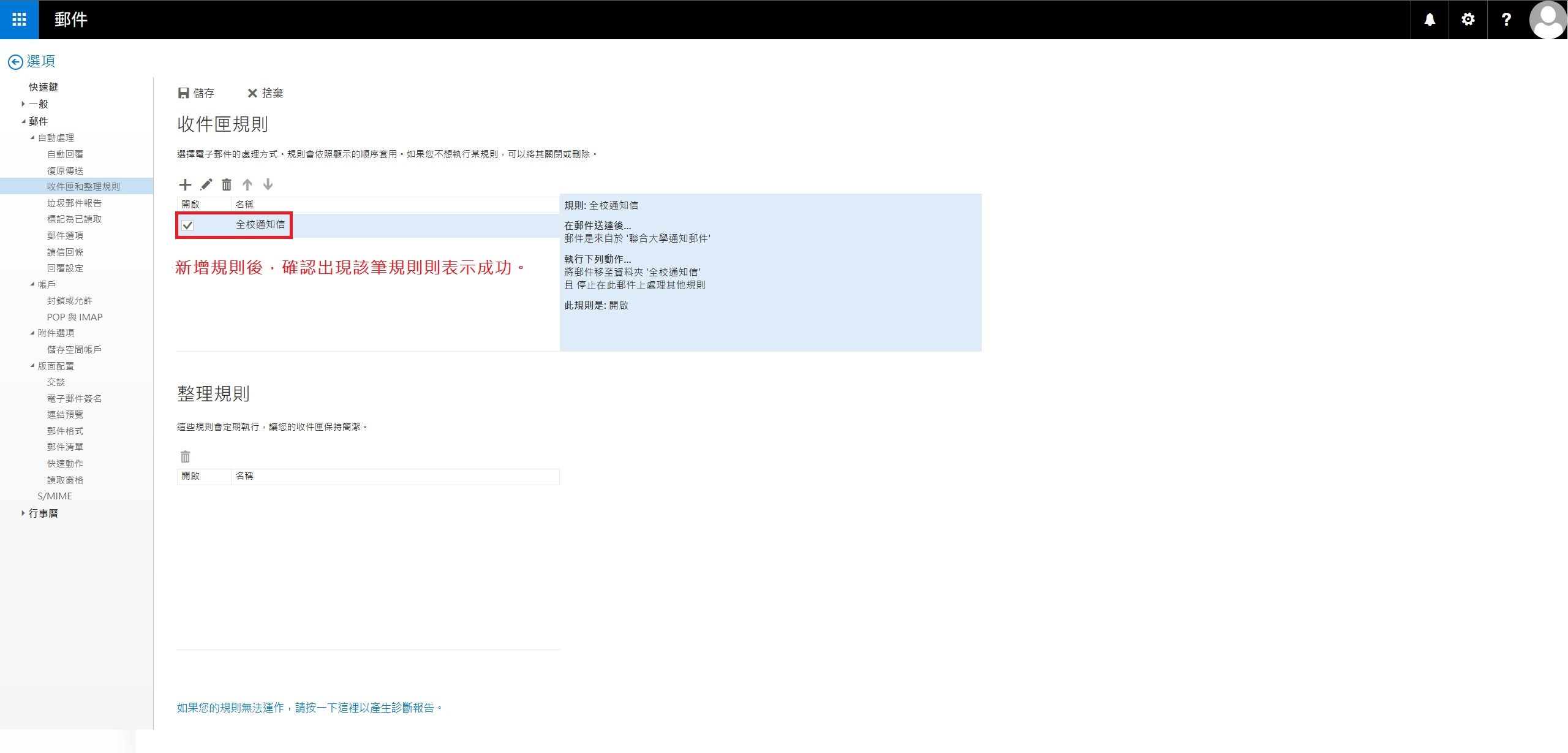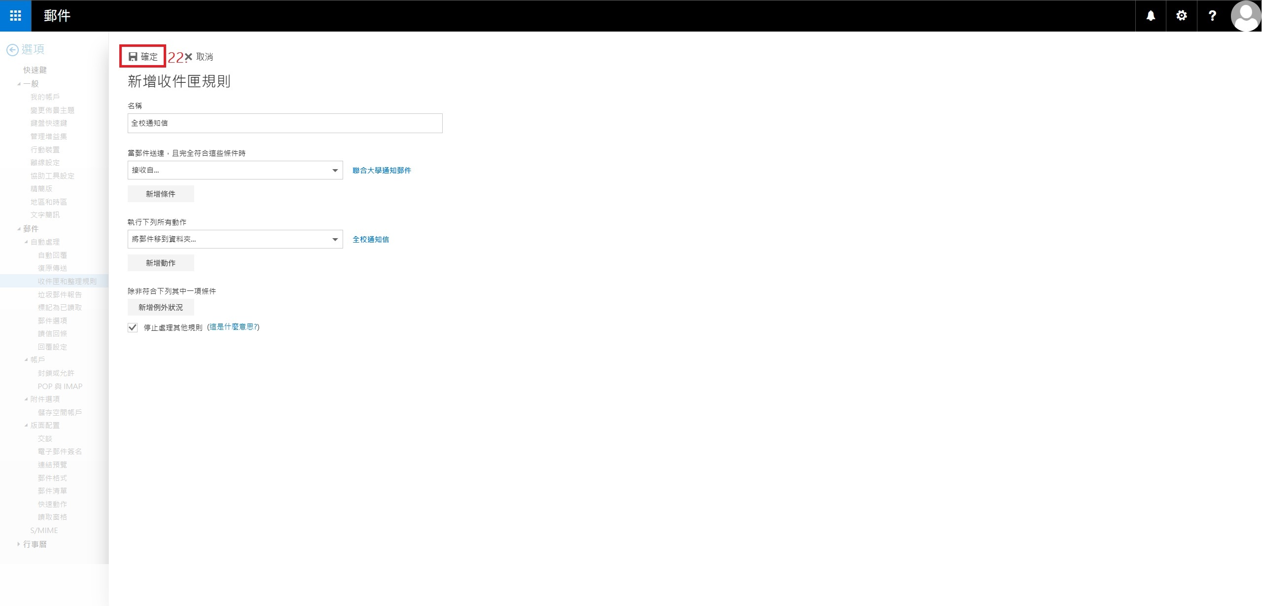 A:以建立全校通知信收納規則為例,請參考下列圖示步驟