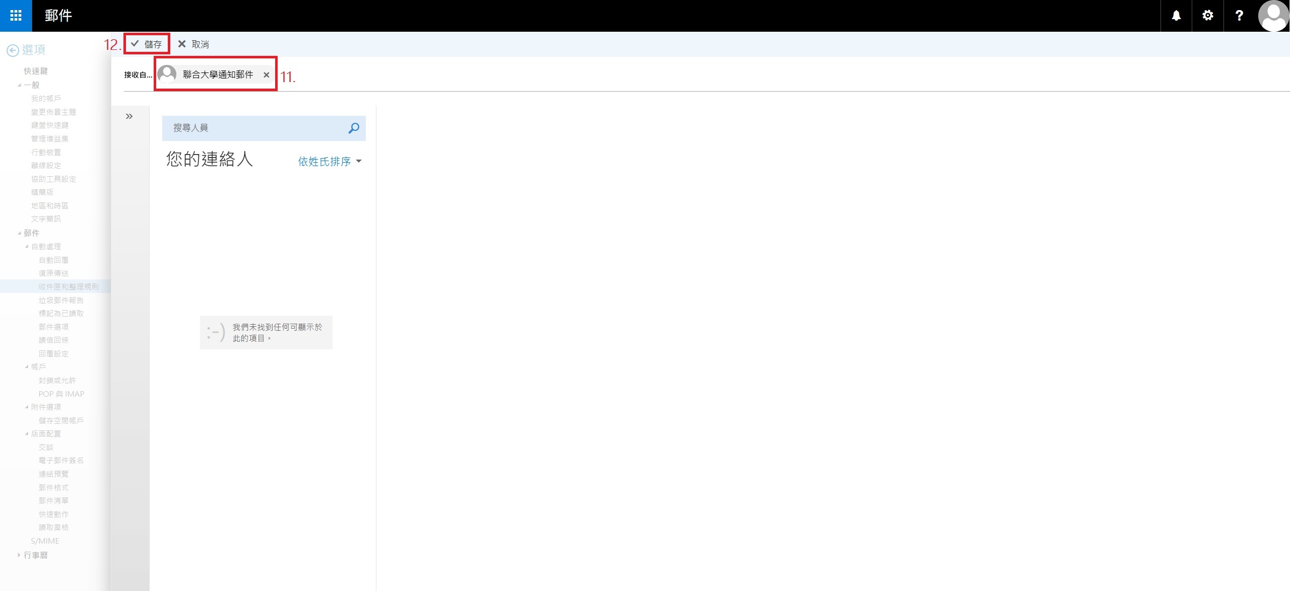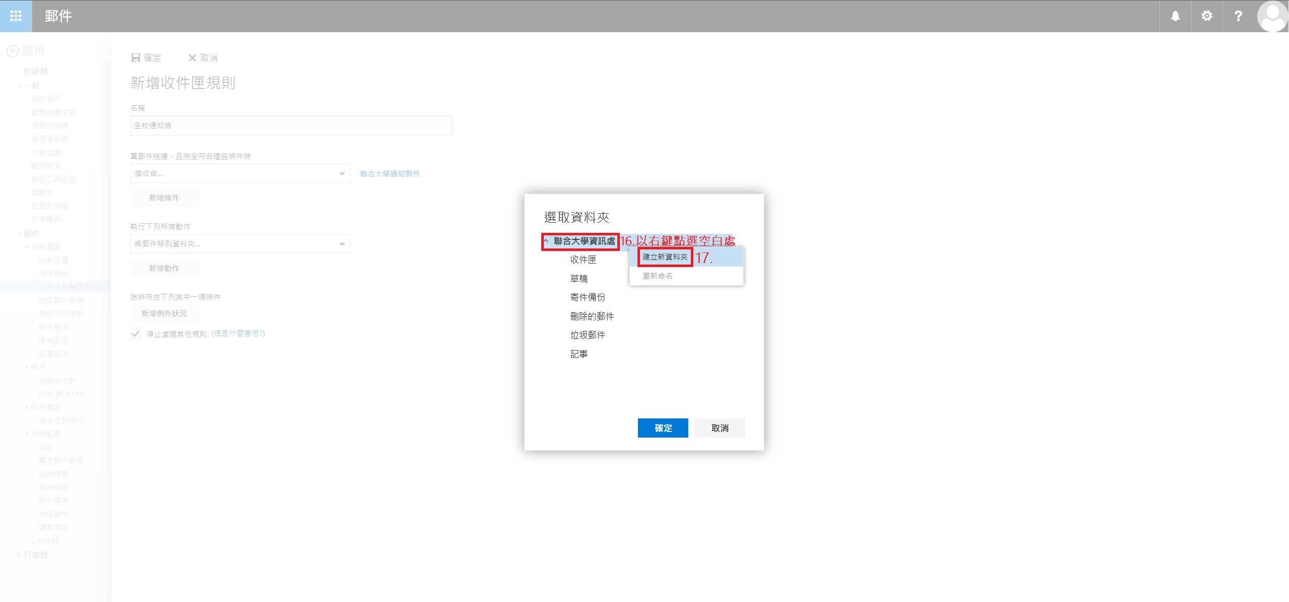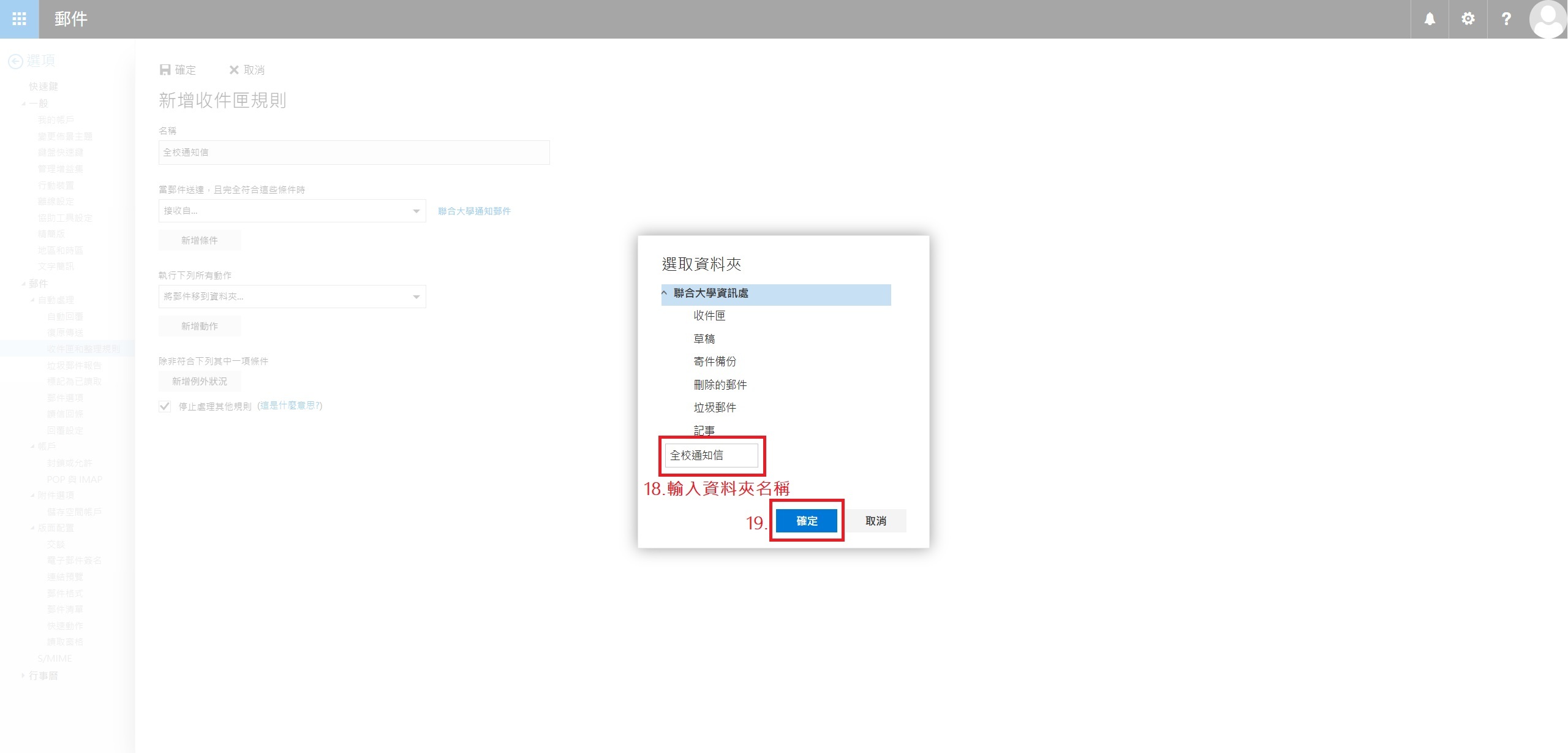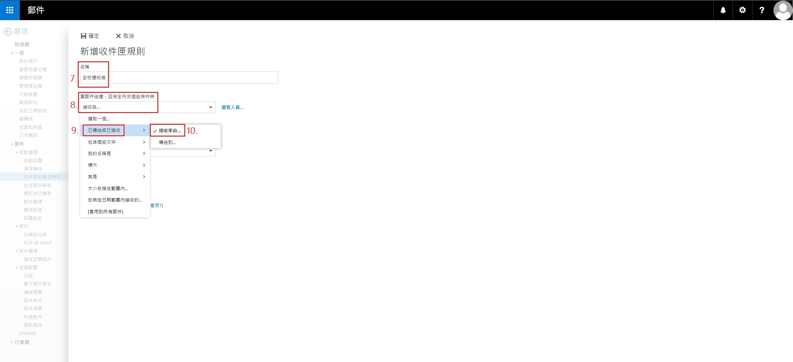 A:以建立全校通知信收納規則為例,請參考下列圖示步驟