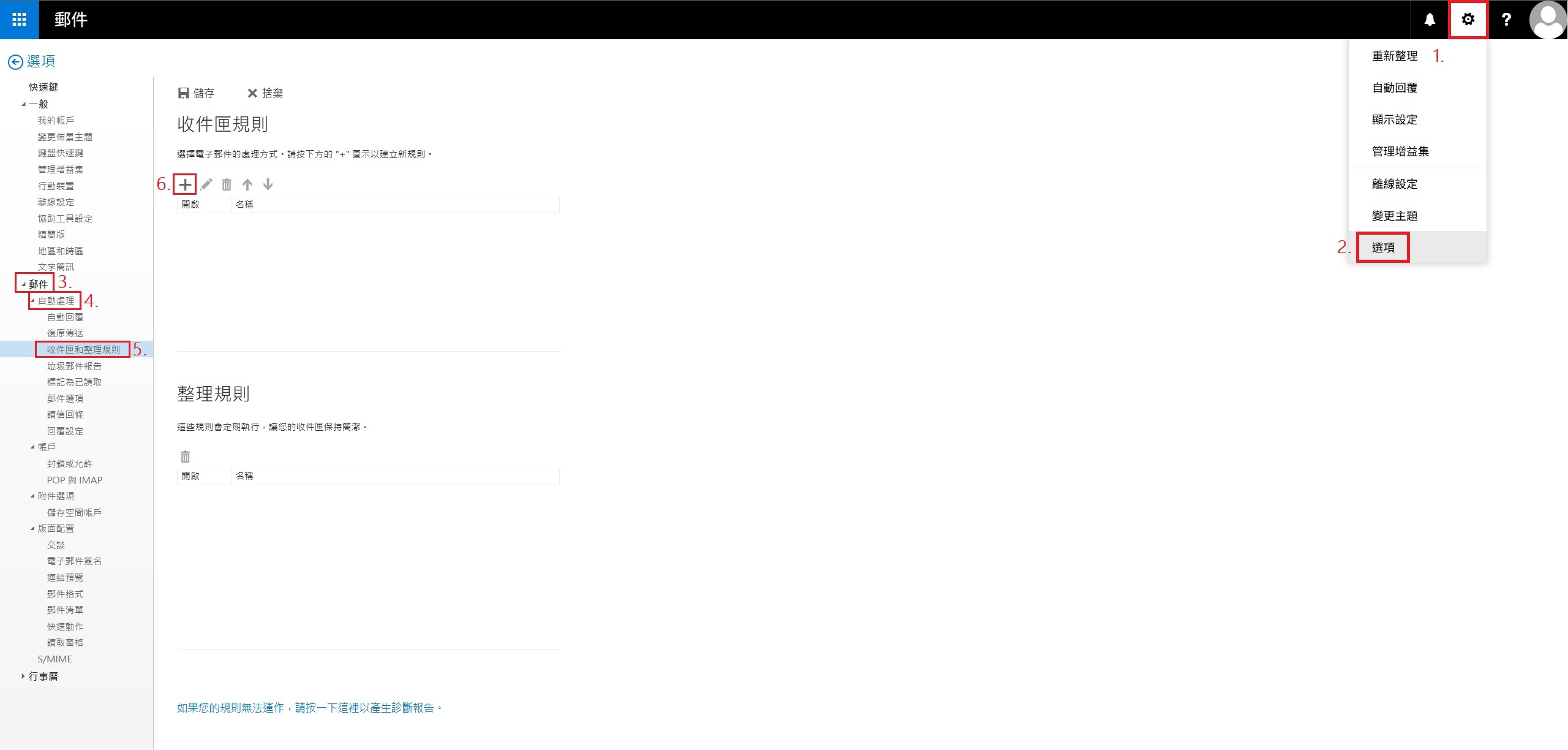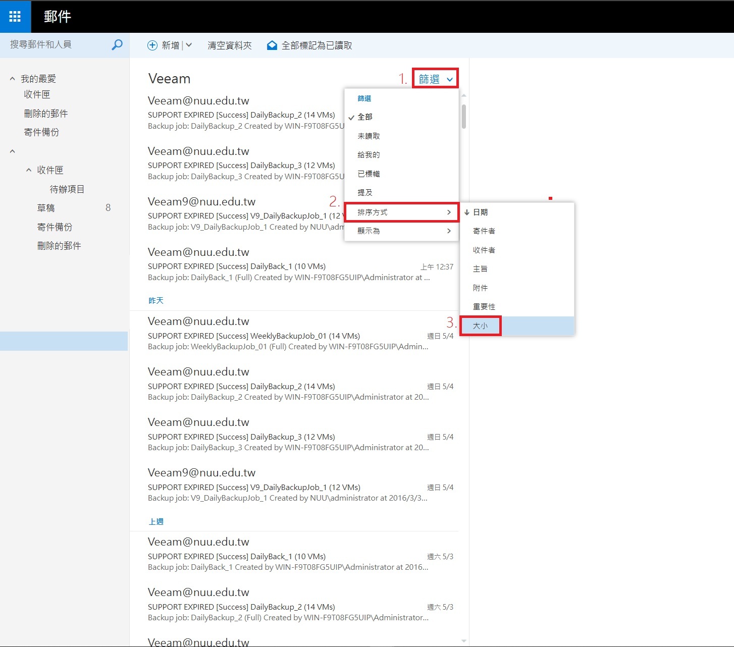 ※若信件種類繁雜,可參考Q3,為信箱建立收件匣規則進行分類,未來收到符合規則的信件則會收納至指派的資料夾中。