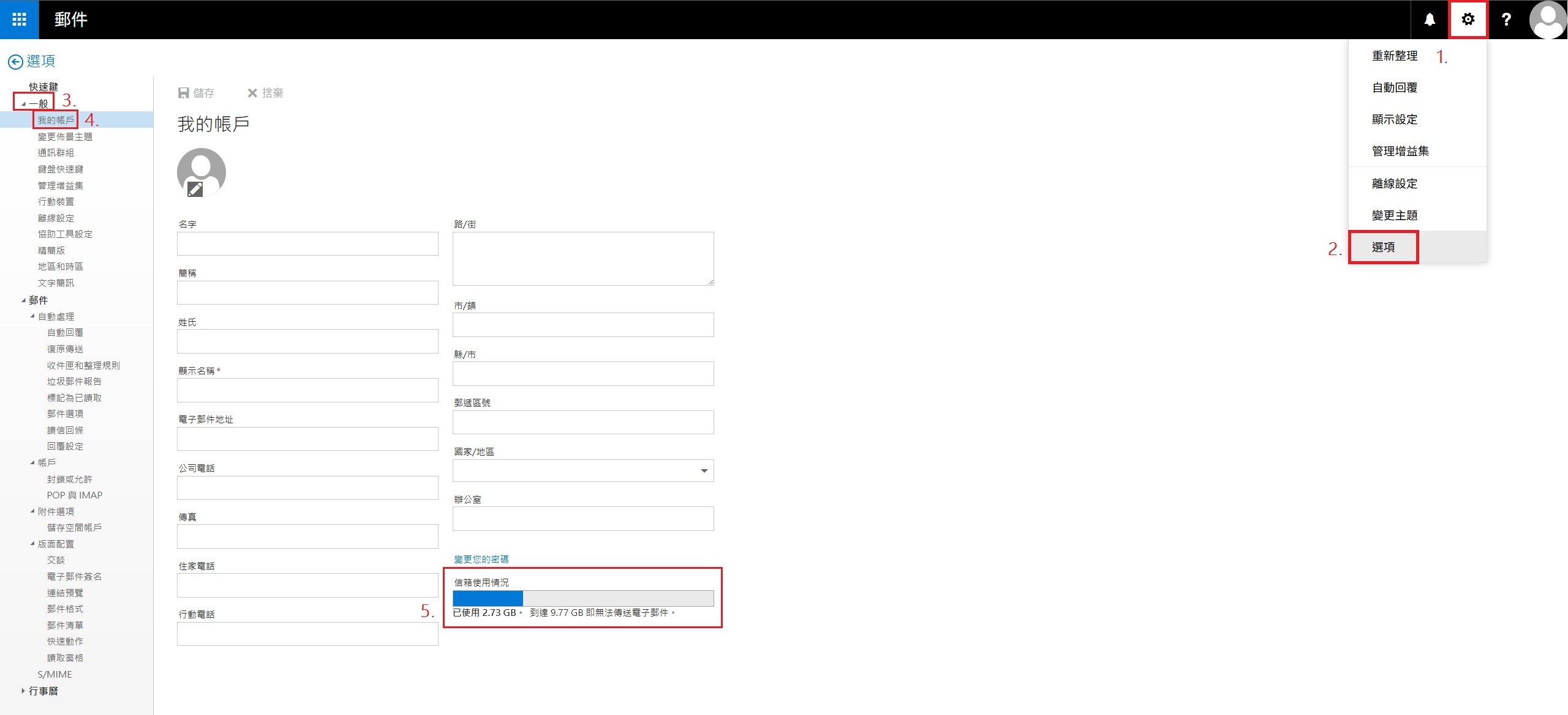 A:請先登入Outlook信箱,並點選右上角⚙️選項 → 一般 → 我的帳戶 ,即可查看目前信箱已使用的容量。